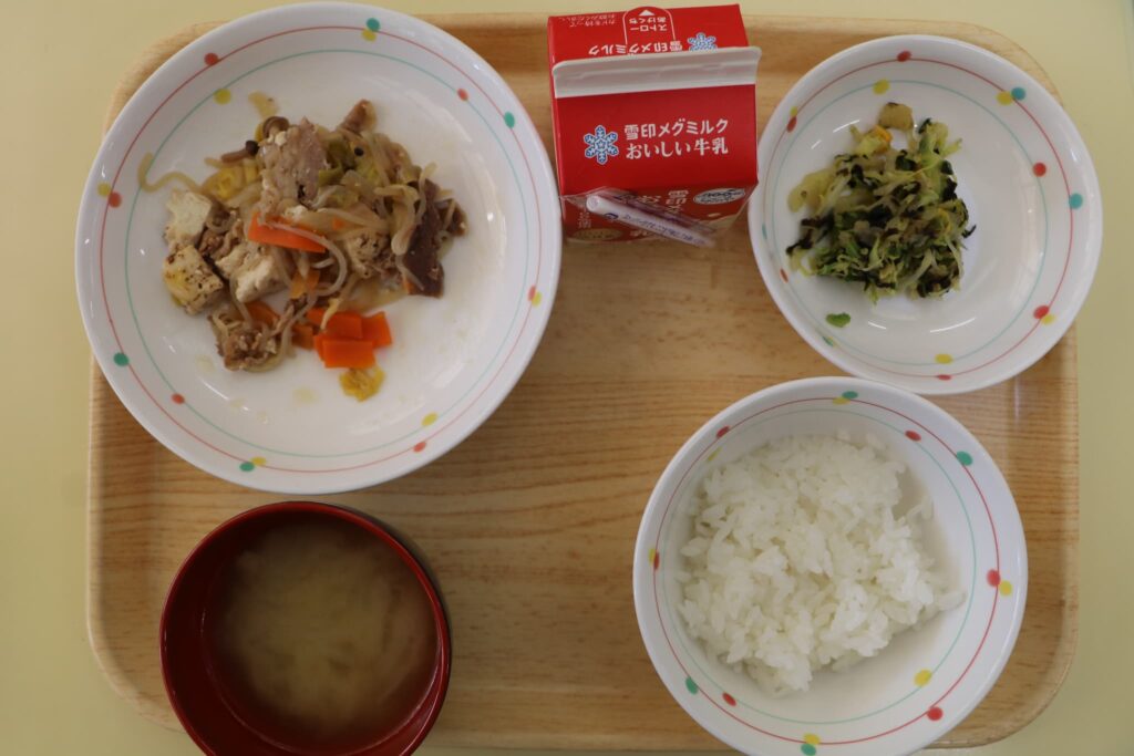 今日の給食:すき焼き風に・磯辺和え・ごはん・みそ汁・牛乳