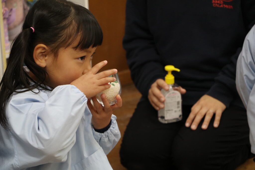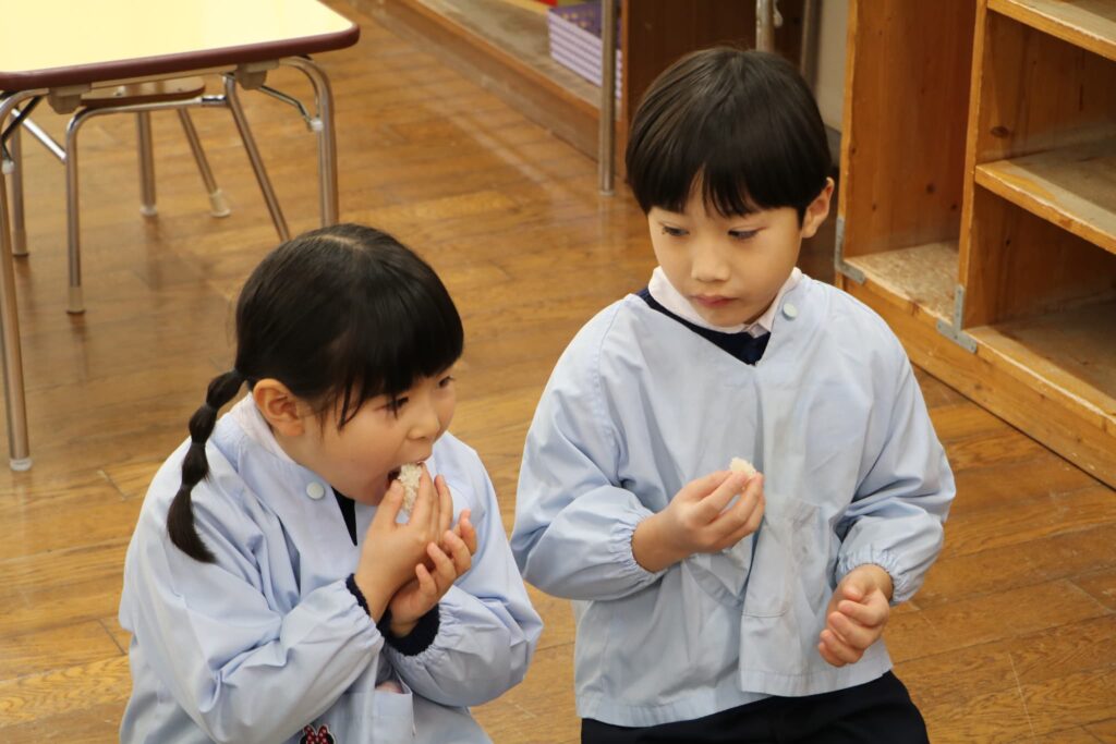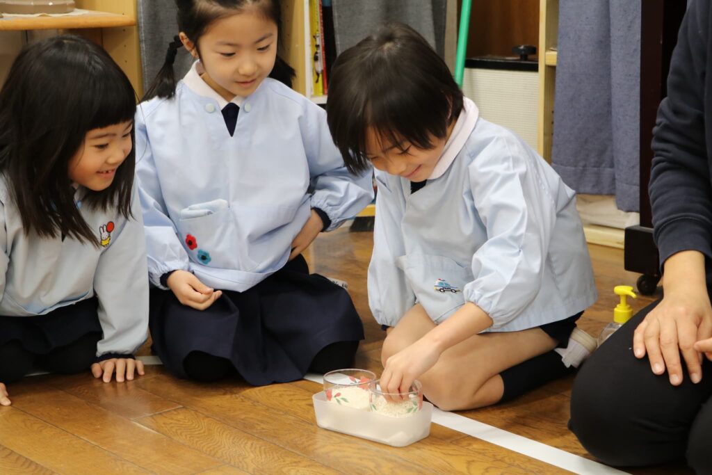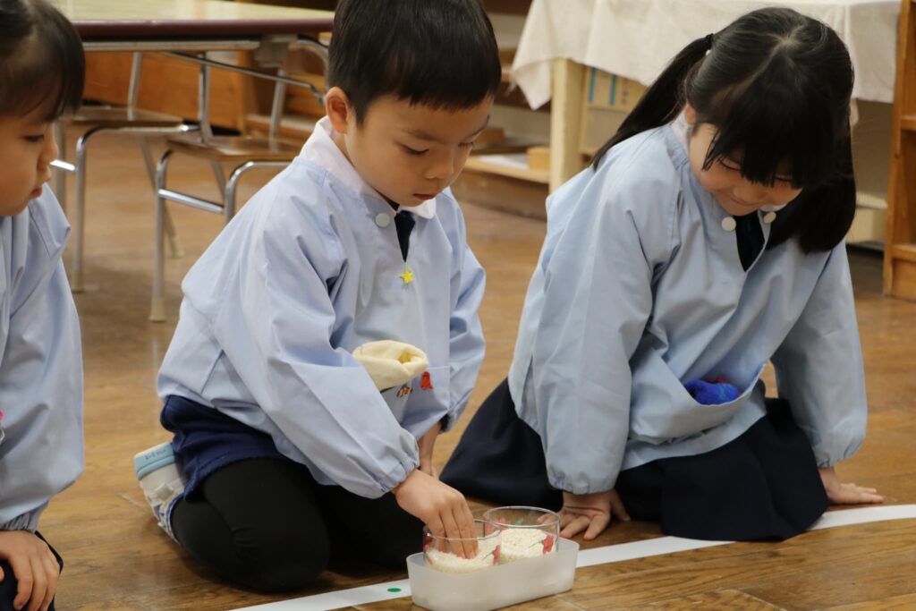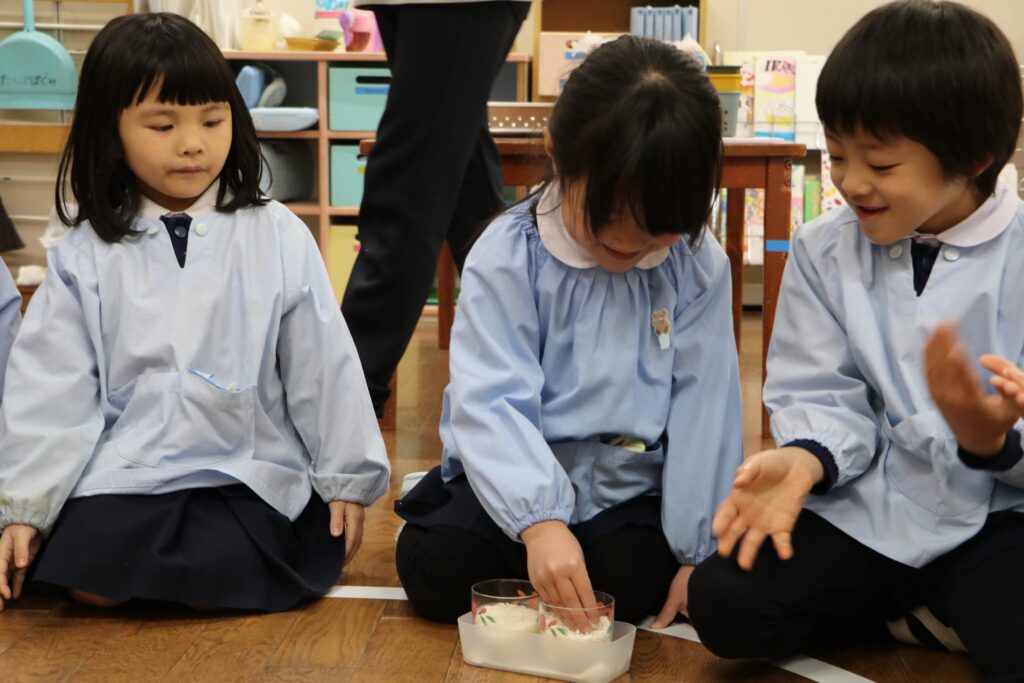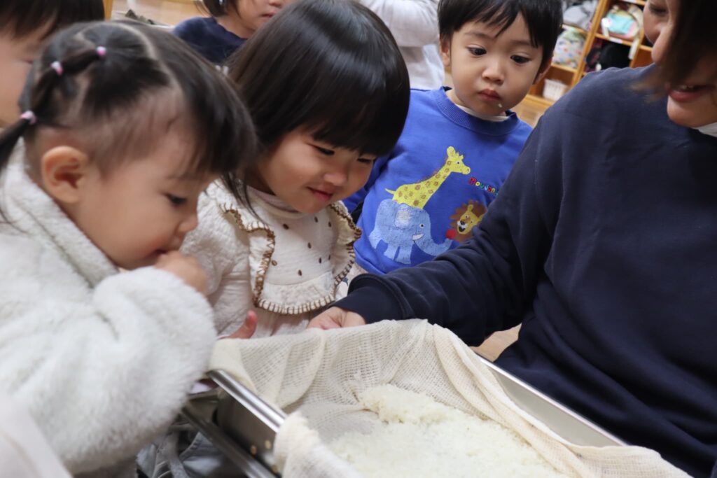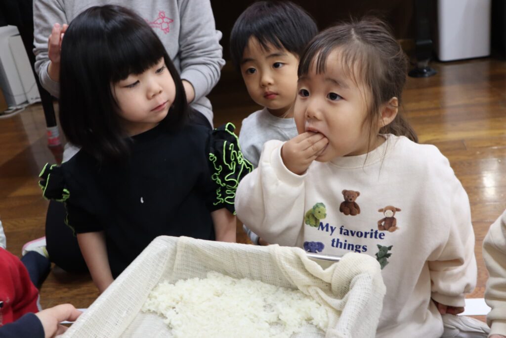 明日は楽しみにしている餅つきです。今日はお餅になる前のもち米のみんなで観察し、試食しました。始まて蒸したもち米(おこわ)を食べた子どもたちもいたようですが、「おいしい!」、「お米の匂いに似てる♪」「噛んでいるとお餅の味がする!」など、五感を通して学ぶことができました。明日の餅つきに向けて準備万端です!明日も子どもたちにとって実りある素敵な一日になりますように☆