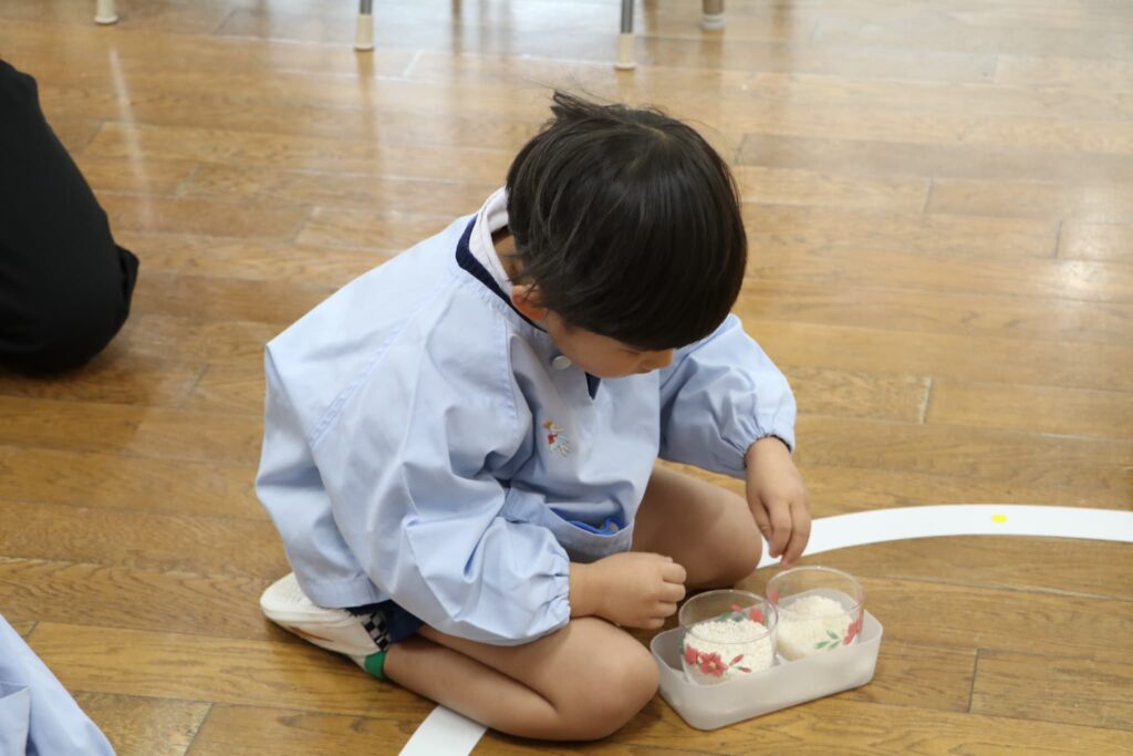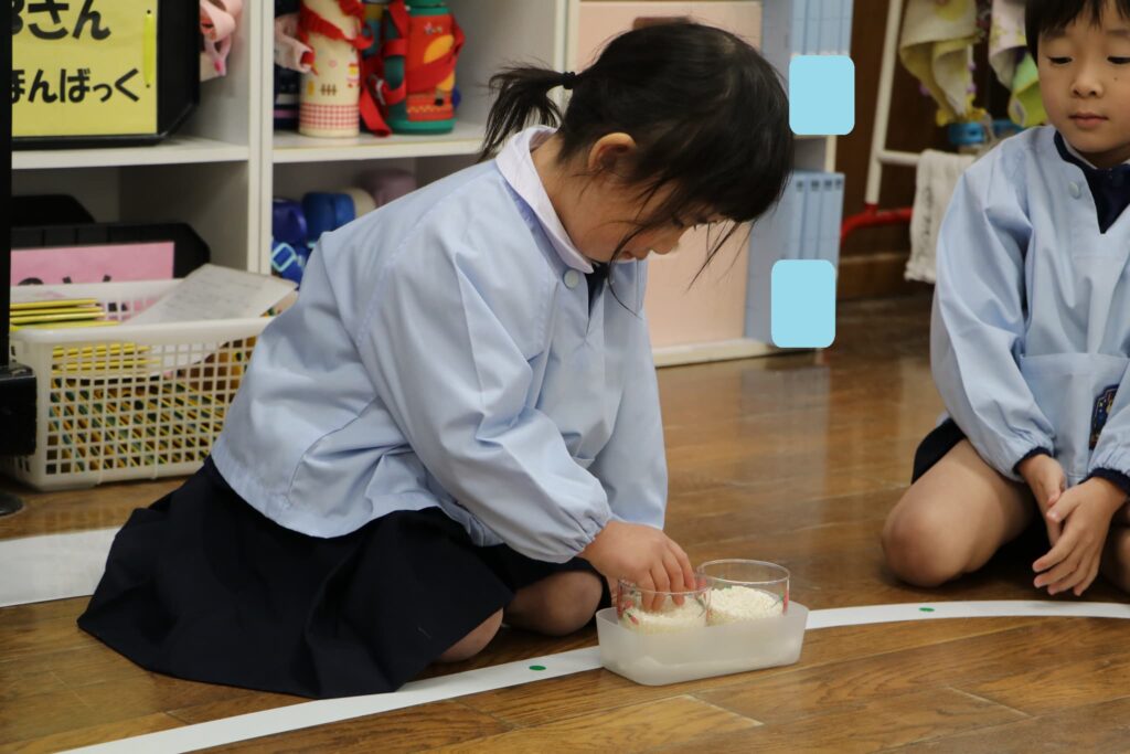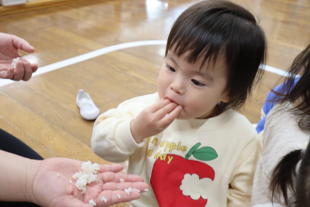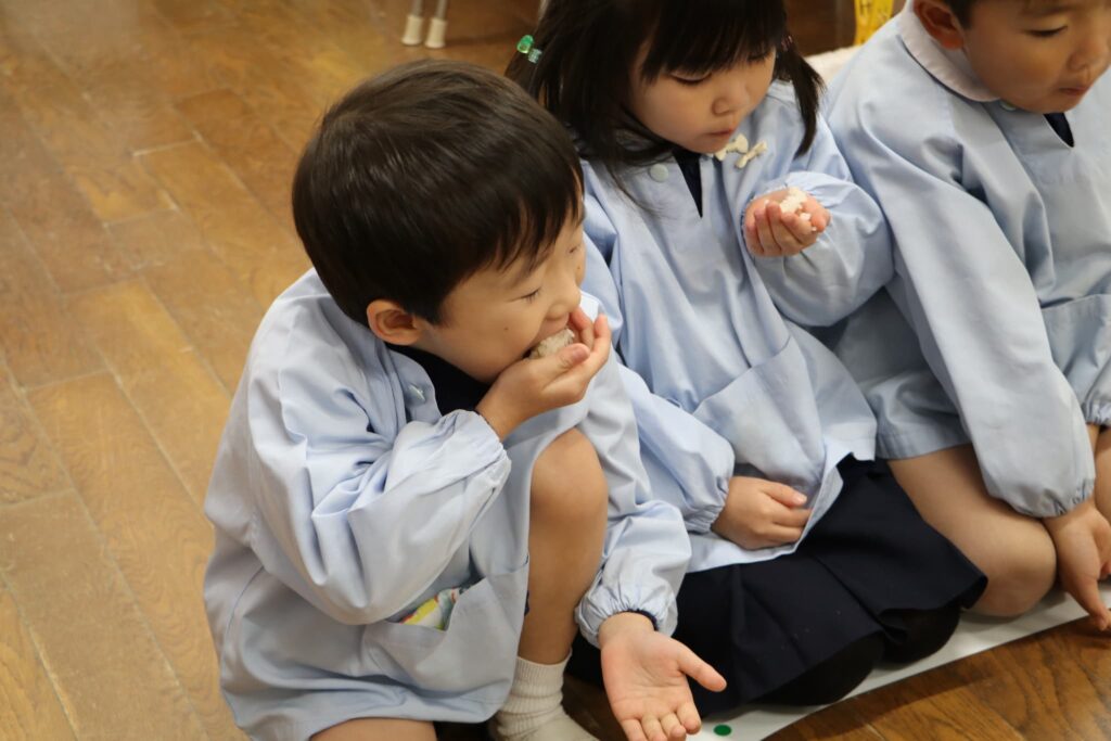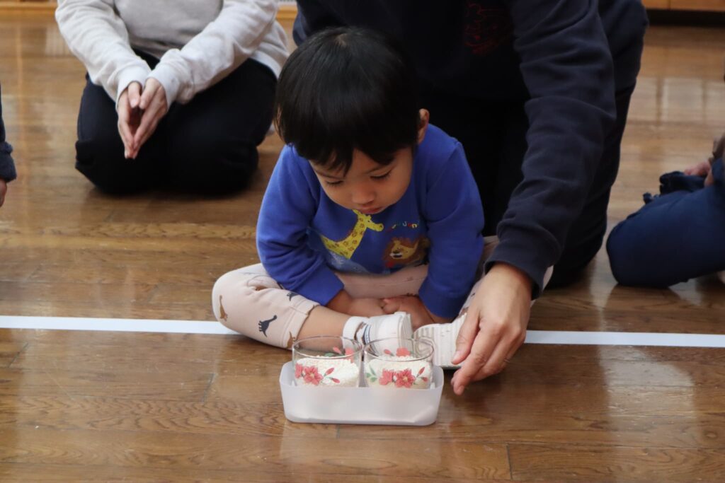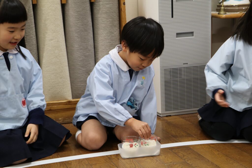 明日は楽しみにしている餅つきです。今日はお餅になる前のもち米のみんなで観察し、試食しました。始まて蒸したもち米(おこわ)を食べた子どもたちもいたようですが、「おいしい!」、「お米の匂いに似てる♪」「噛んでいるとお餅の味がする!」など、五感を通して学ぶことができました。明日の餅つきに向けて準備万端です!明日も子どもたちにとって実りある素敵な一日になりますように☆