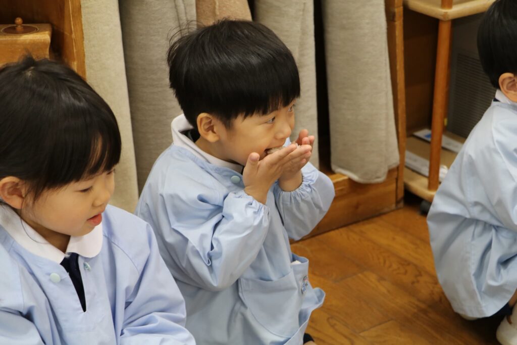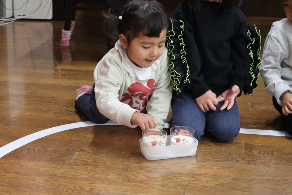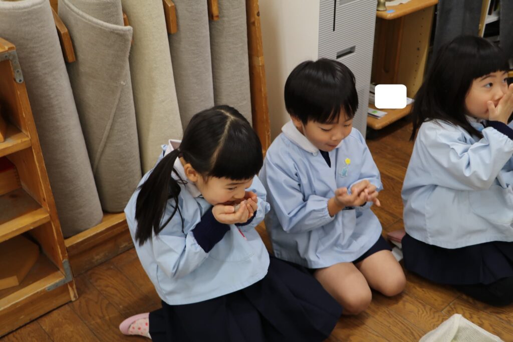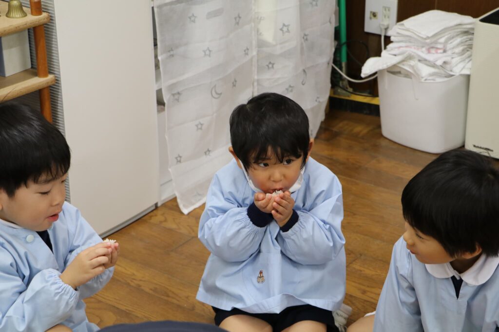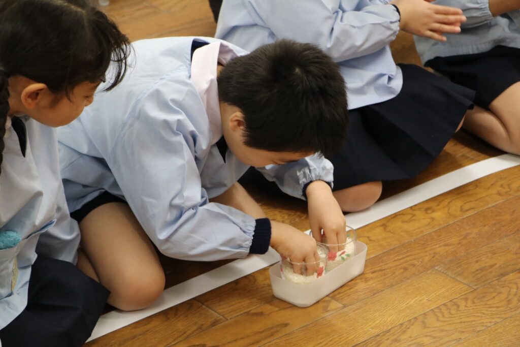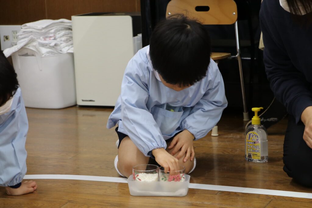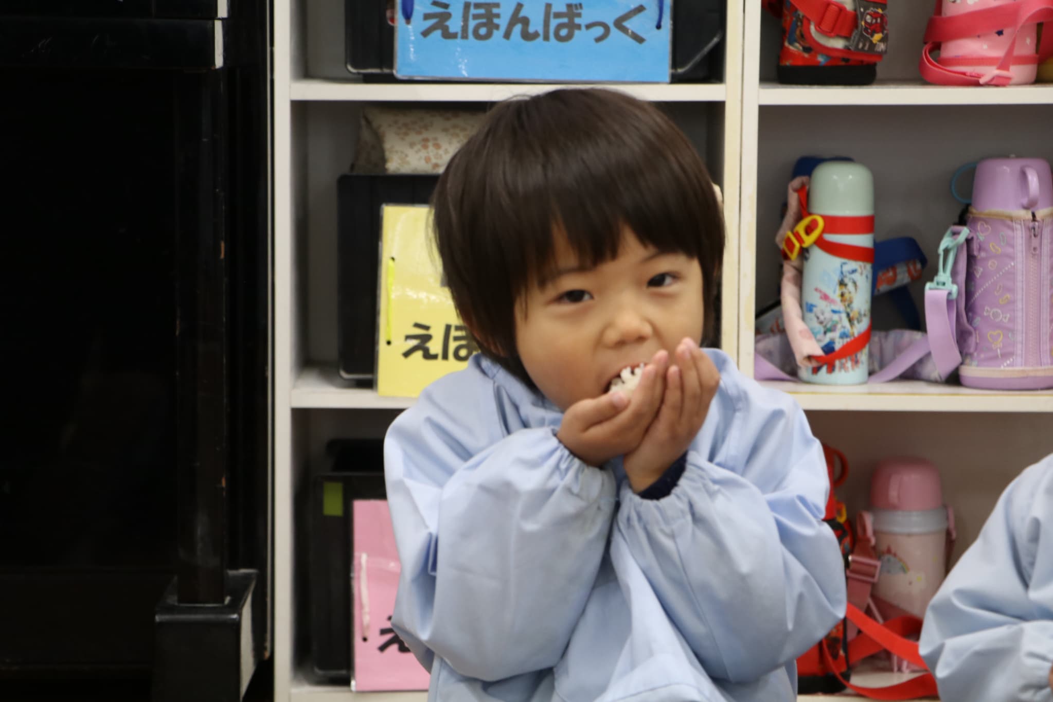 明日は楽しみにしている餅つきです。今日はお餅になる前のもち米のみんなで観察し、試食しました。始まて蒸したもち米(おこわ)を食べた子どもたちもいたようですが、「おいしい!」、「お米の匂いに似てる♪」「噛んでいるとお餅の味がする!」など、五感を通して学ぶことができました。明日の餅つきに向けて準備万端です!明日も子どもたちにとって実りある素敵な一日になりますように☆