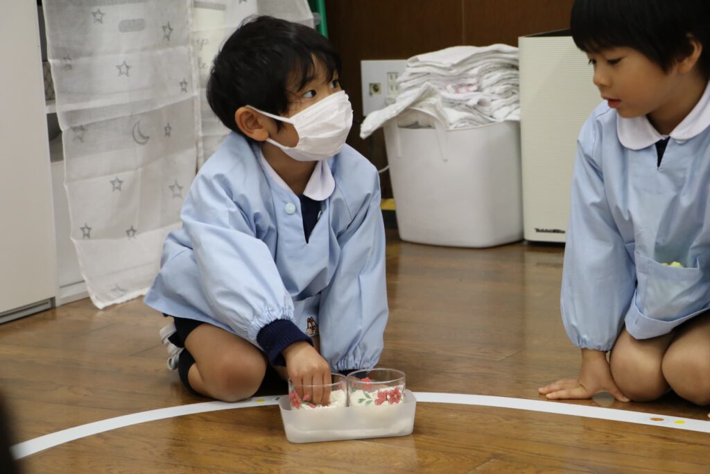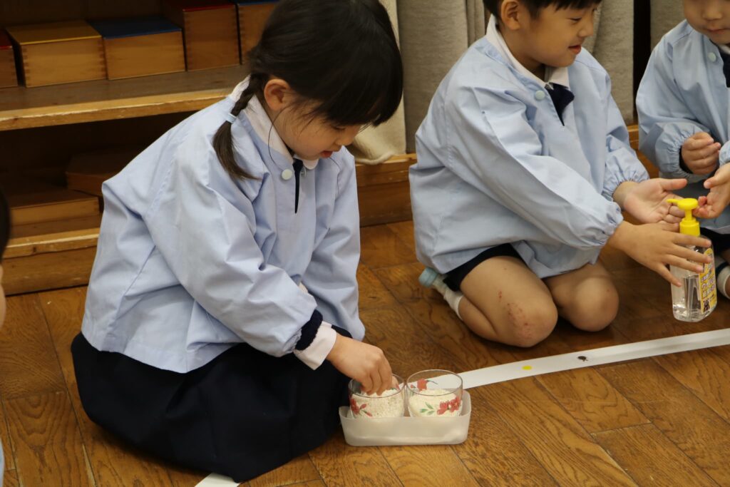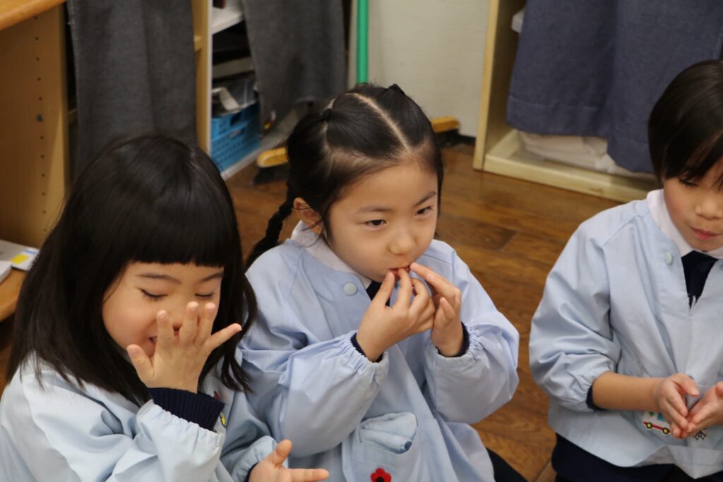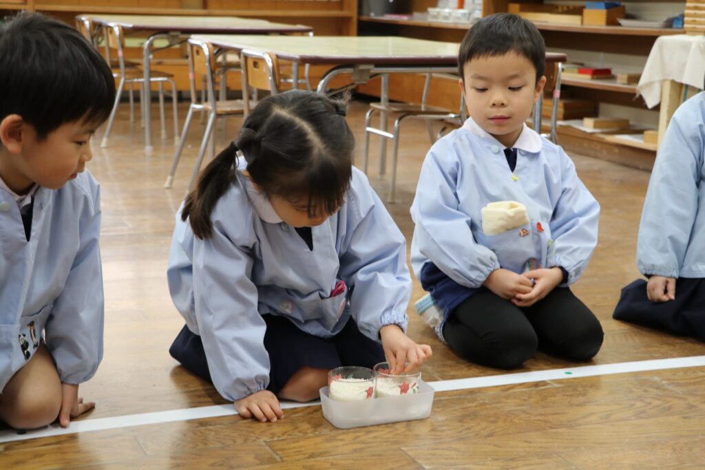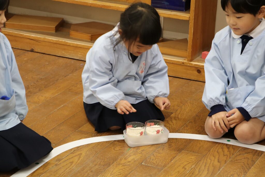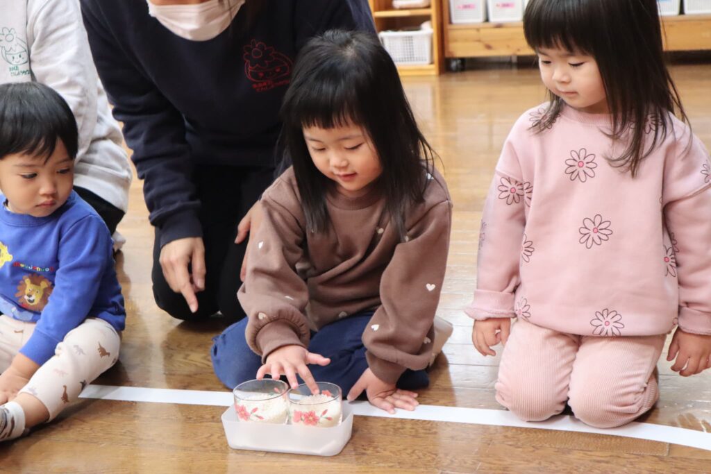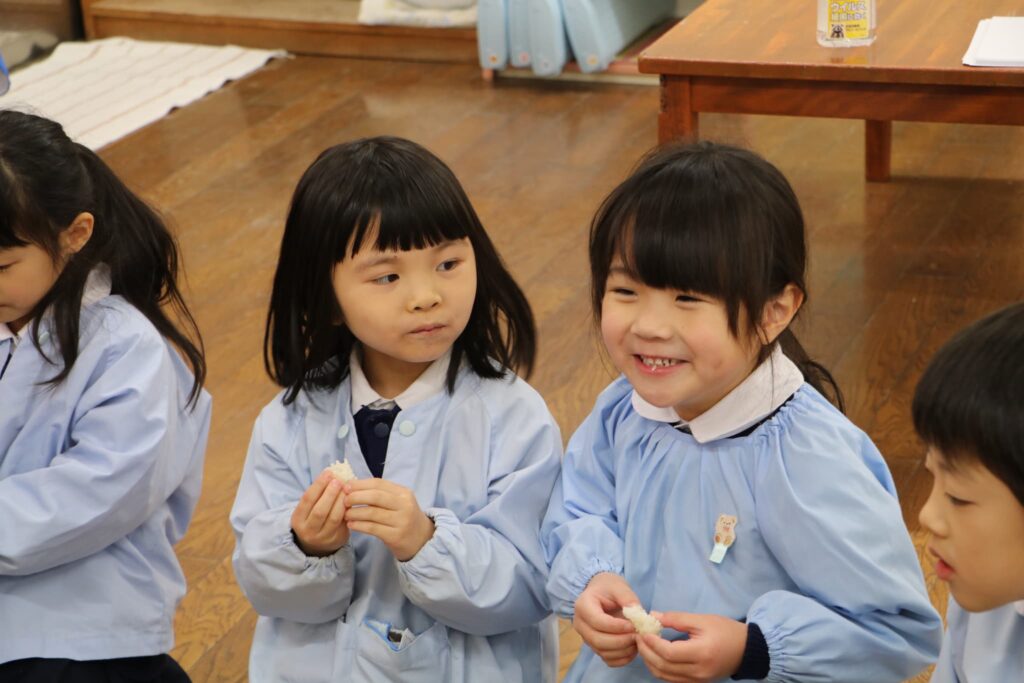明日は楽しみにしている餅つきです。今日はお餅になる前のもち米のみんなで観察し、試食しました。始まて蒸したもち米(おこわ)を食べた子どもたちもいたようですが、「おいしい!」、「お米の匂いに似てる♪」「噛んでいるとお餅の味がする!」など、五感を通して学ぶことができました。明日の餅つきに向けて準備万端です!明日も子どもたちにとって実りある素敵な一日になりますように☆