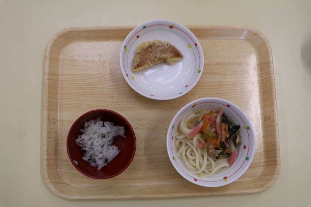 今日の給食:五目うどん・さつま揚げの天ぷら・わかめごはん