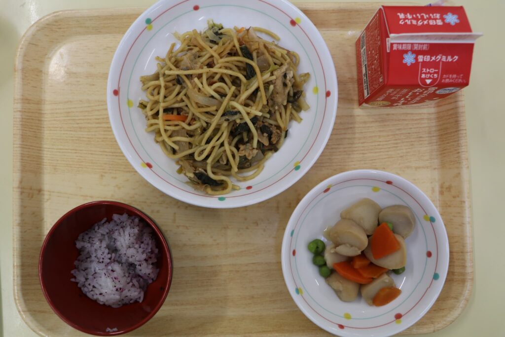 今日の給食:焼きそば・里芋の煮物・ゆかりごはん・牛乳