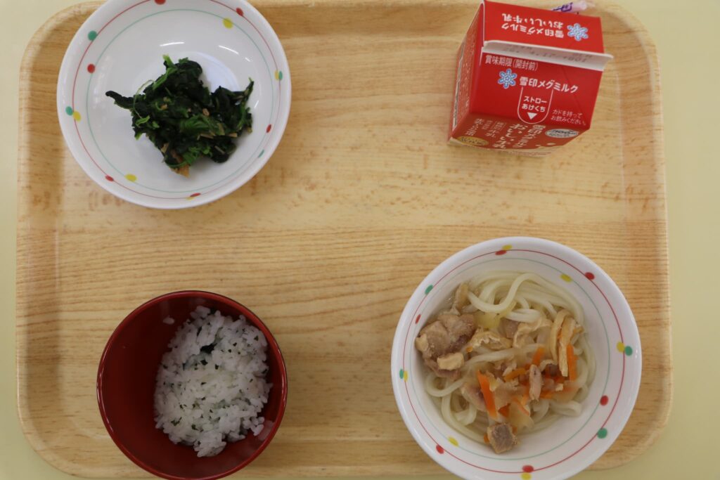 今日の給食:鶏きつねうどん・ほうれん草のなめたけ和え・わかめごはん・牛乳