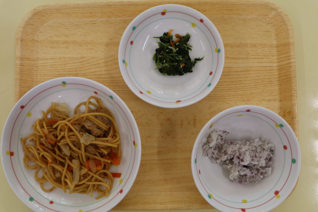 今日の給食:焼きそば・ほうれん草のシラス和え・ゆかりごはん
