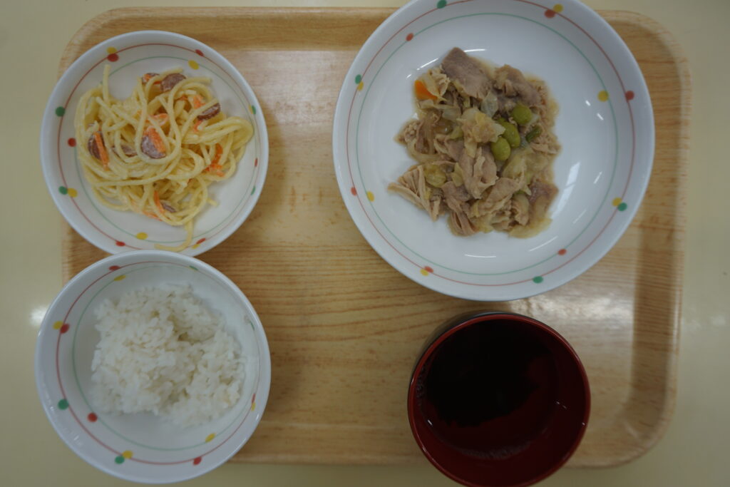 今日の給食:豚肉のみそ炒め・スパサラダ・ごはん・すまし汁