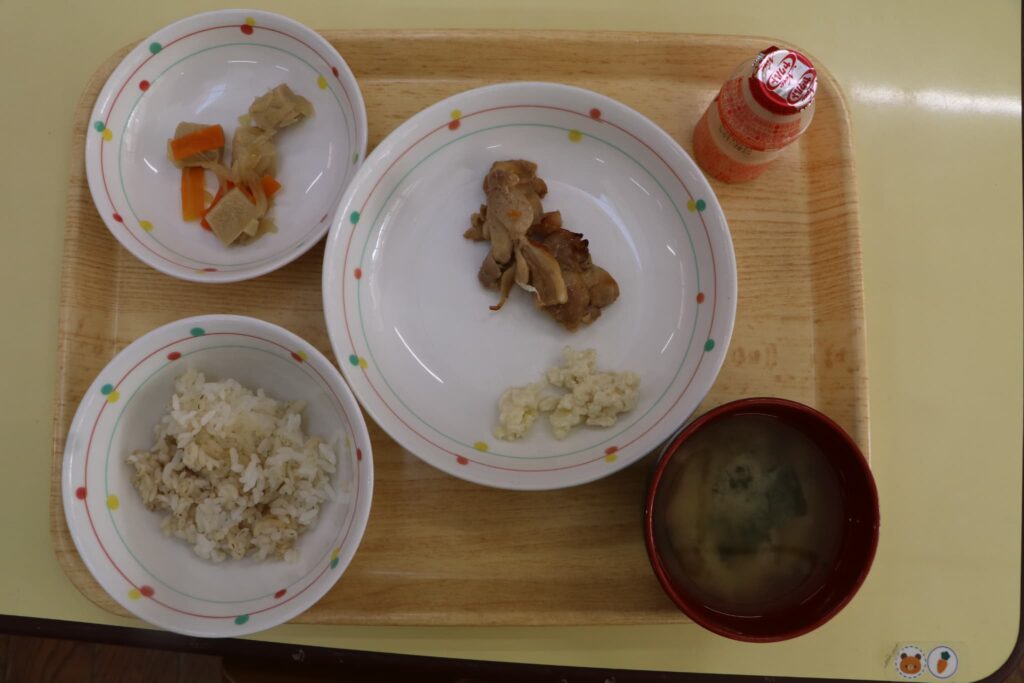 今日の給食:鶏肉のマーマレード焼き・いり高野豆腐・麦ごはん・みそ汁・ヤクルト