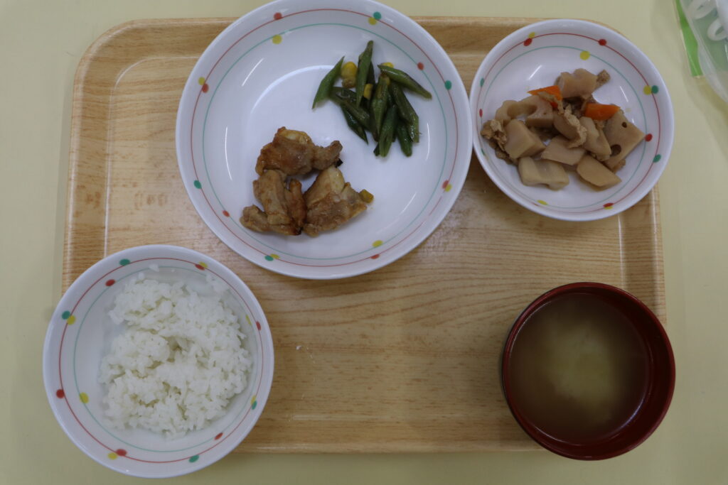 今日の給食:タンドリーチキン・レンコンの炒め煮・ごはん・みそ汁