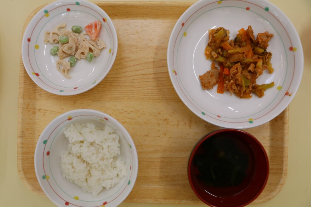 今日の給食:ポークチャップ・れんこんサラダ・ごはん・コンソメスープ