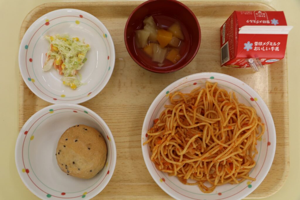 今日の給食:スパゲッティミートソース・コーンサラダ・フルーツポンチ・パン・牛乳