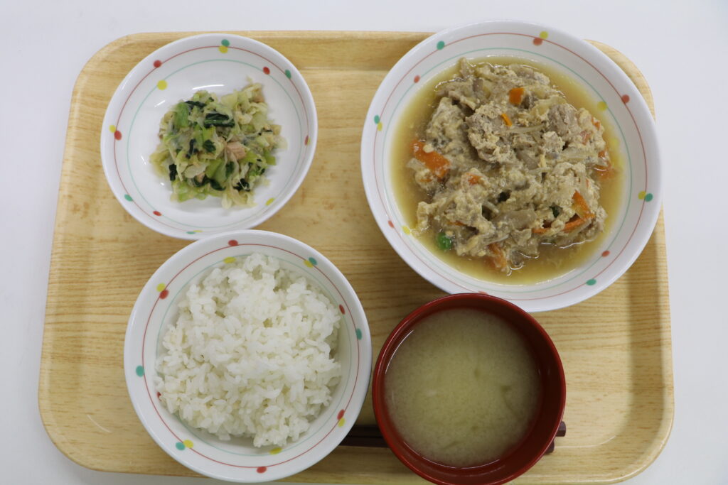 今日の給食:豚肉の柳川煮・キャベツのツナ和え・ご飯・みそ汁・牛乳