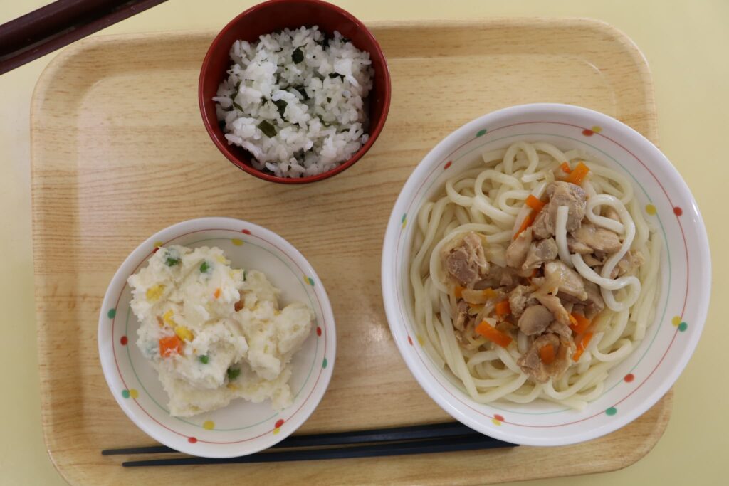 今日の給食:とりきつねうどん・ポテトサラダ・わかめごはん