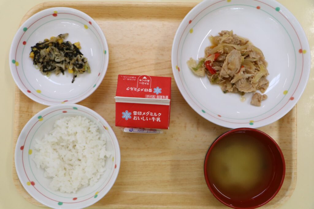 今日の給食:豚肉の香味焼き・磯辺和え・ごはん・みそ汁・牛乳