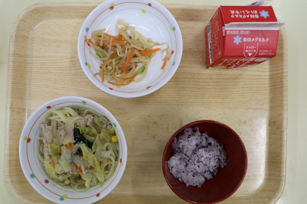 今日の給食:野菜ラーメン・もやしのごま和え・ゆかりごはん・牛乳