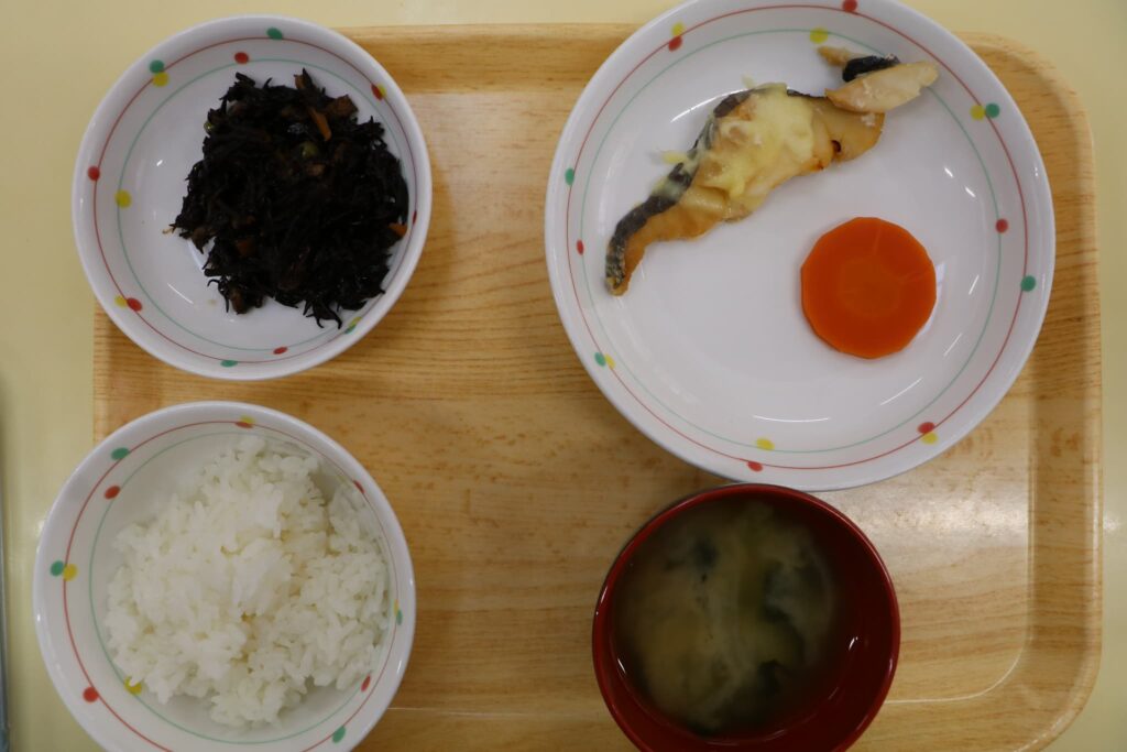 今日の給食:魚の和風チーズ焼き・ひじきの炒め煮・ごはん・みそ汁