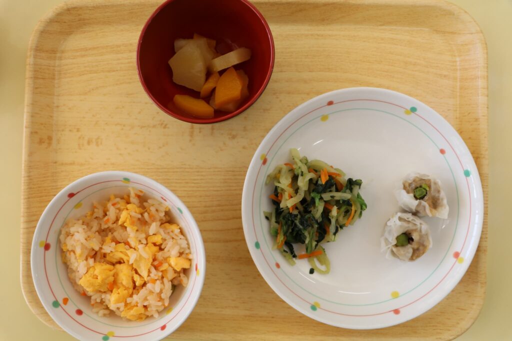 今日の給食:鮭チャーハン・シュウマイ・ほうれん草のナムル・フルーツポンチ