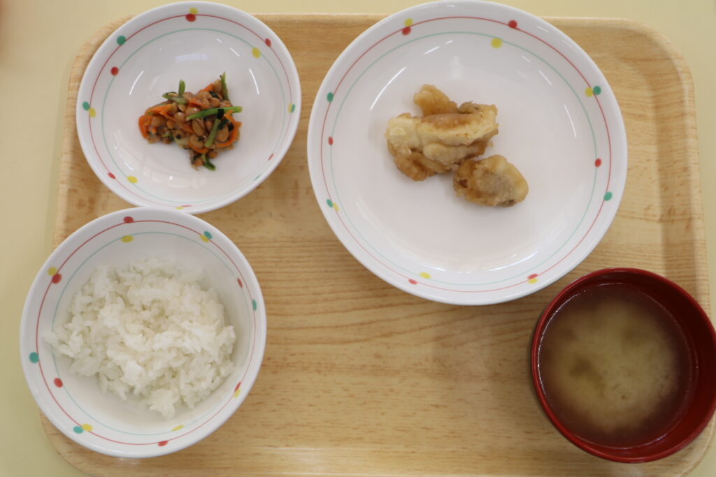 今日の給食:鶏肉の唐揚げみぞれがけ・納豆和え・ごはん・みそ汁