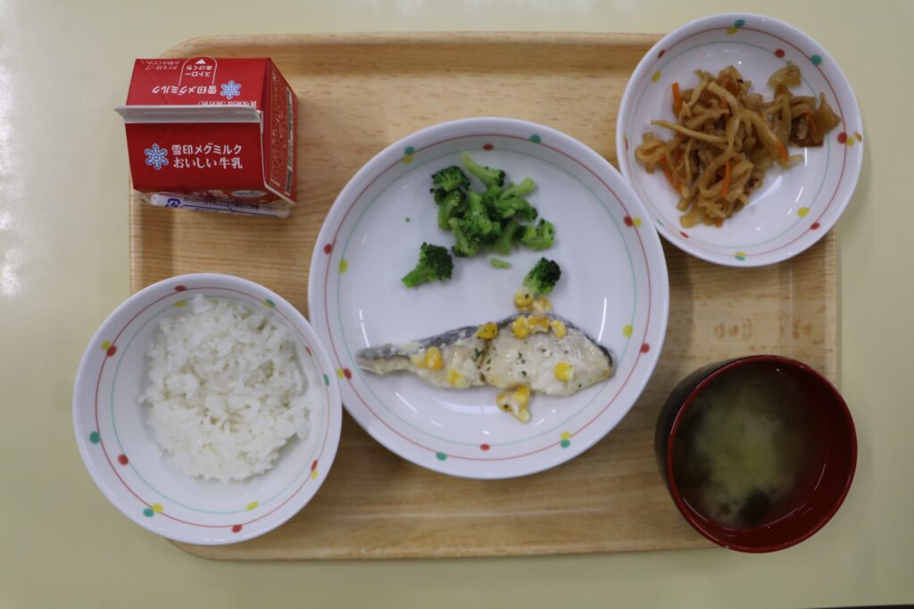 今日の給食:魚のコーンマヨ焼・切干大根のソース炒め・ごはん・みそ汁・牛乳