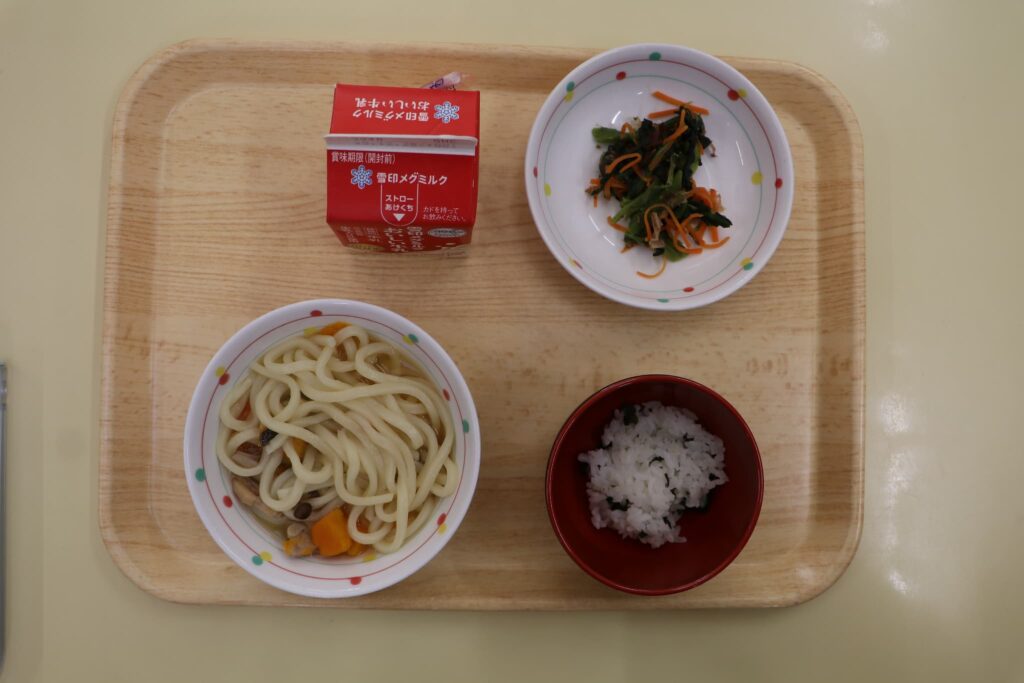 今日の給食:ほうとう風うどん・ほうれん草のおかか和え・わかめごはん・牛乳
