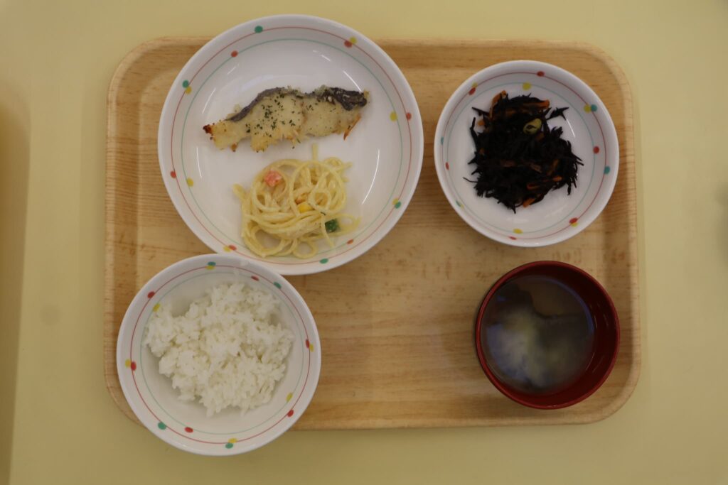 今日の給食:魚のパン粉焼・ひじきの炒め煮・ごはん・みそ汁
