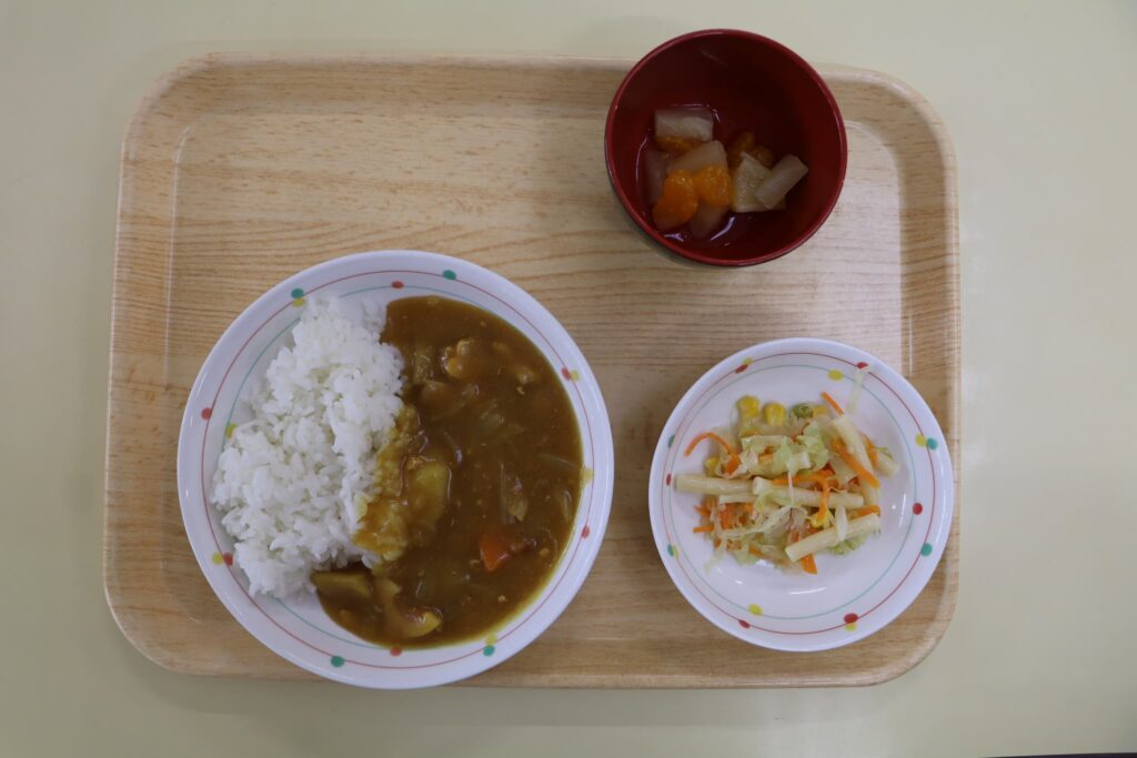 今日の給食:根菜カレーライス・レモンサラダ・フルーツポンチ