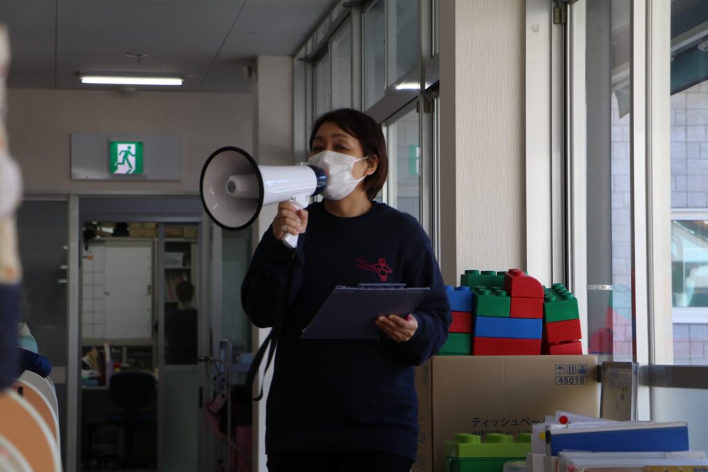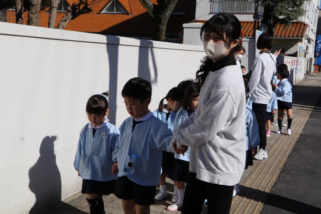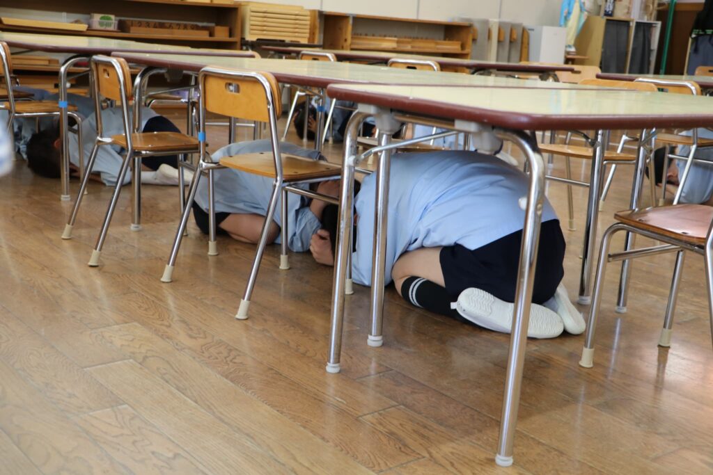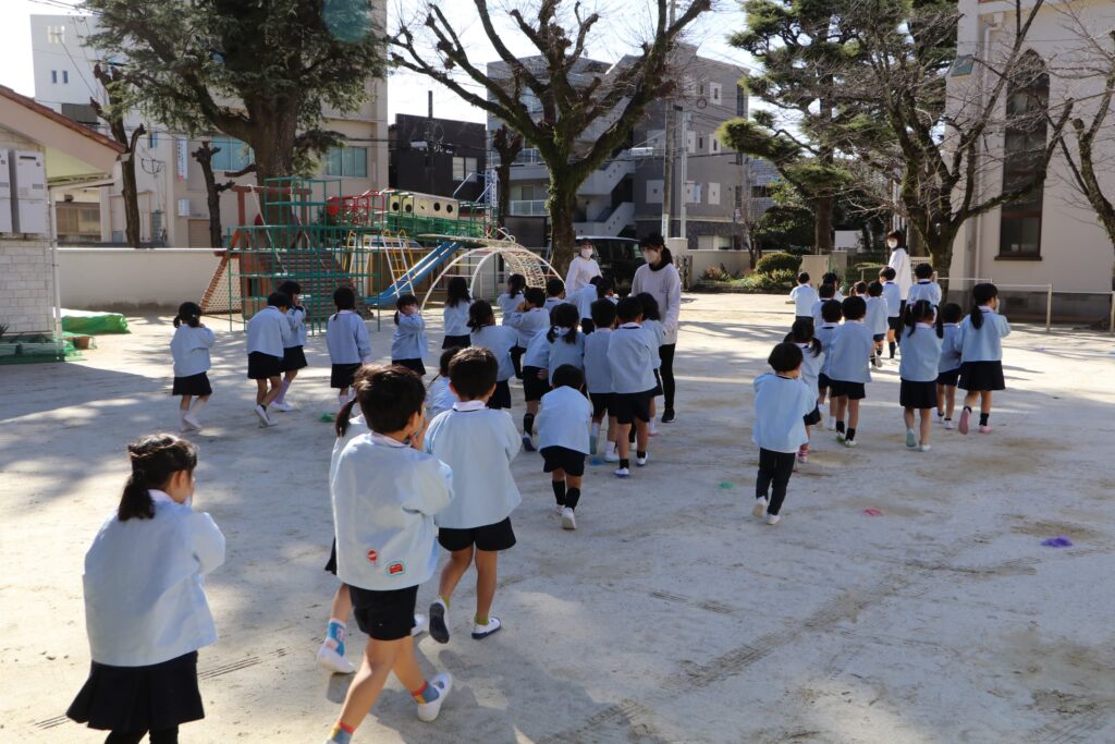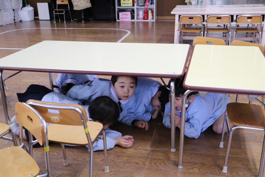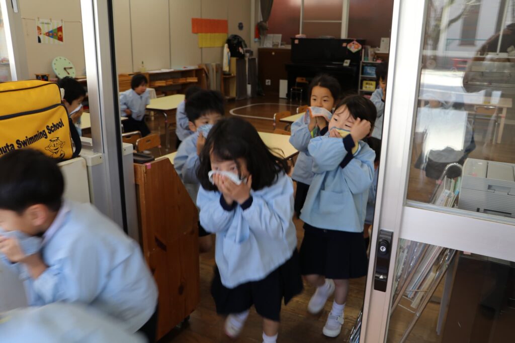 地震が起きたことを想定し、幼稚園から避難指定校へ歩いて避難しました。