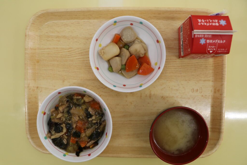 今日の給食:和風あんかけ丼・里芋の煮物・みそ汁・牛乳