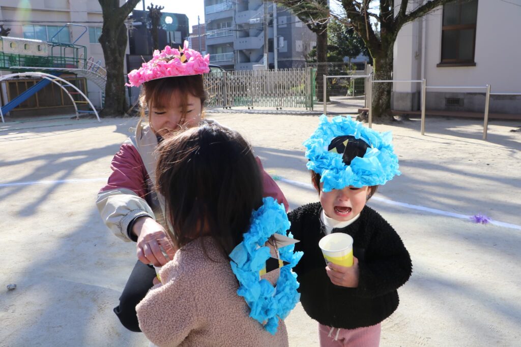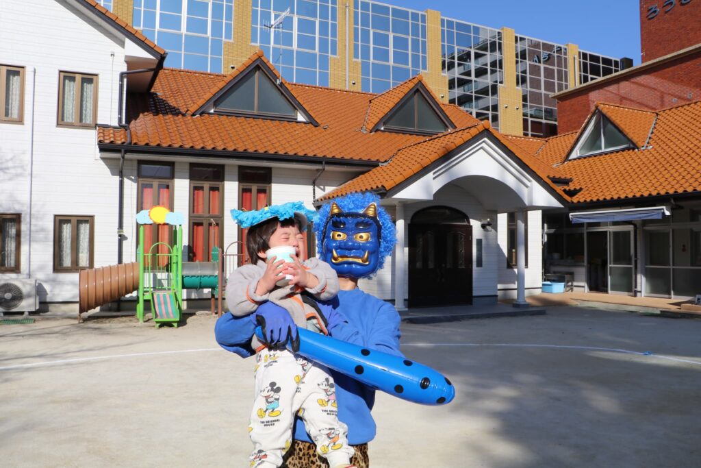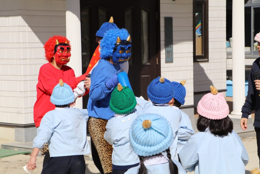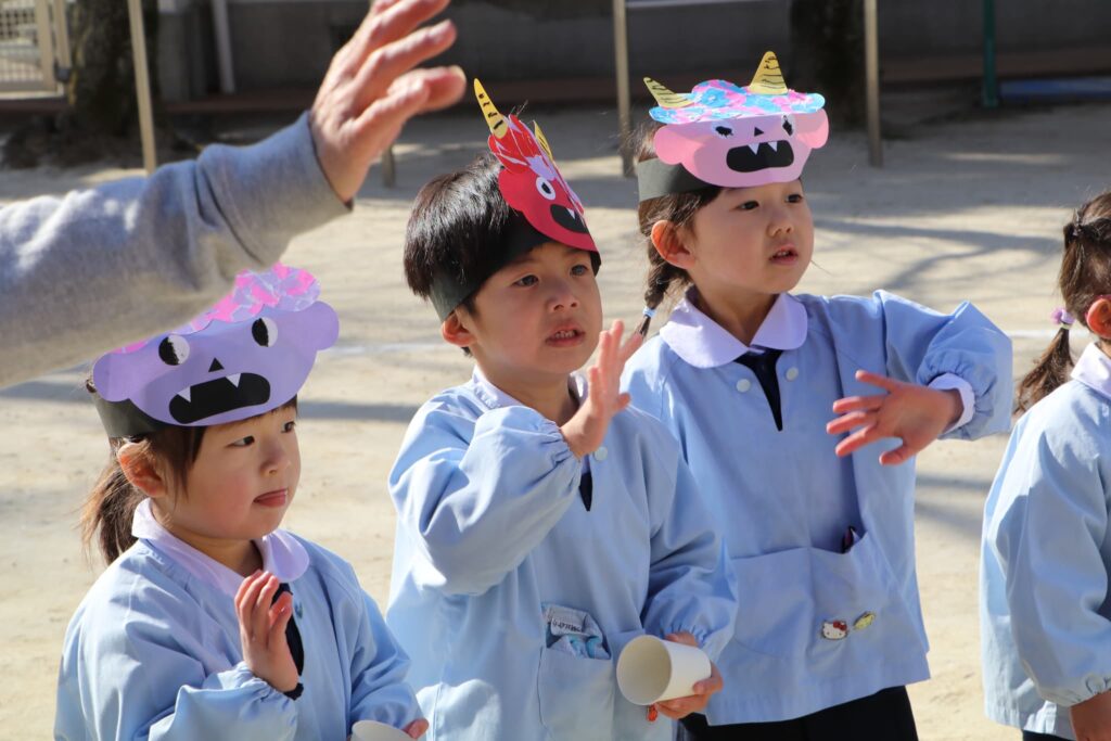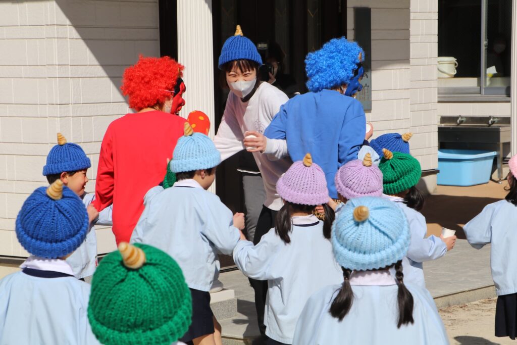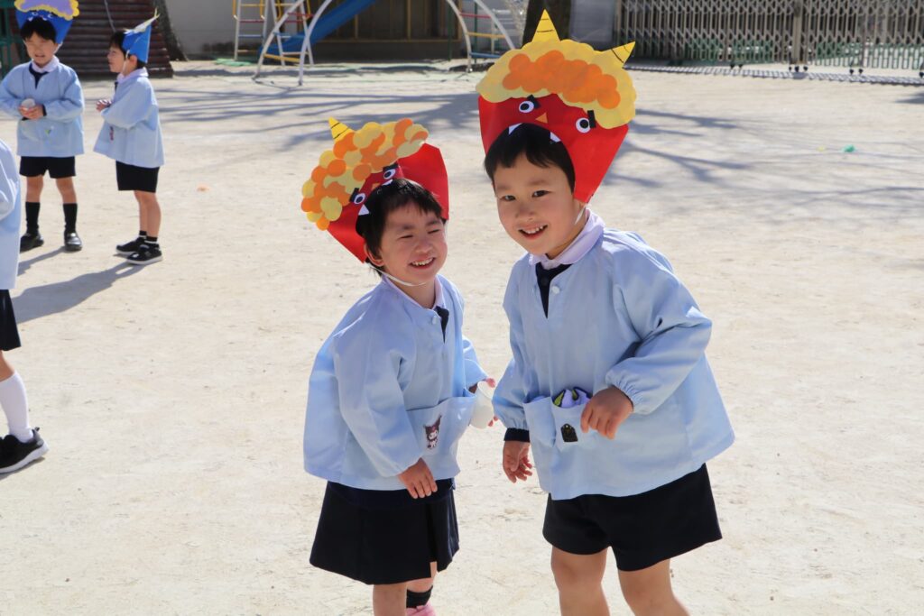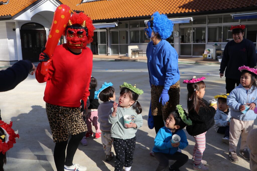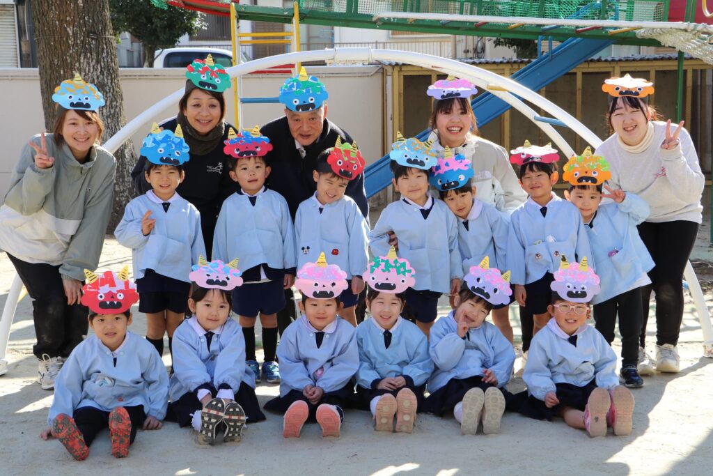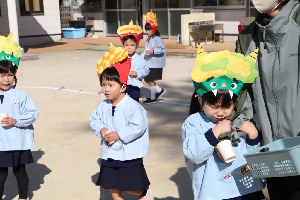 子どもたちが苦手とする日、『節分』。心の中にいる鬼を退治するために、怖い鬼さんにも立ち向かい、優しい福の神を招き入れることができたようです!子どもたちが製作した鬼のお面、帽子。お家で豆まきをするときにぜひ使ってくださいね♪