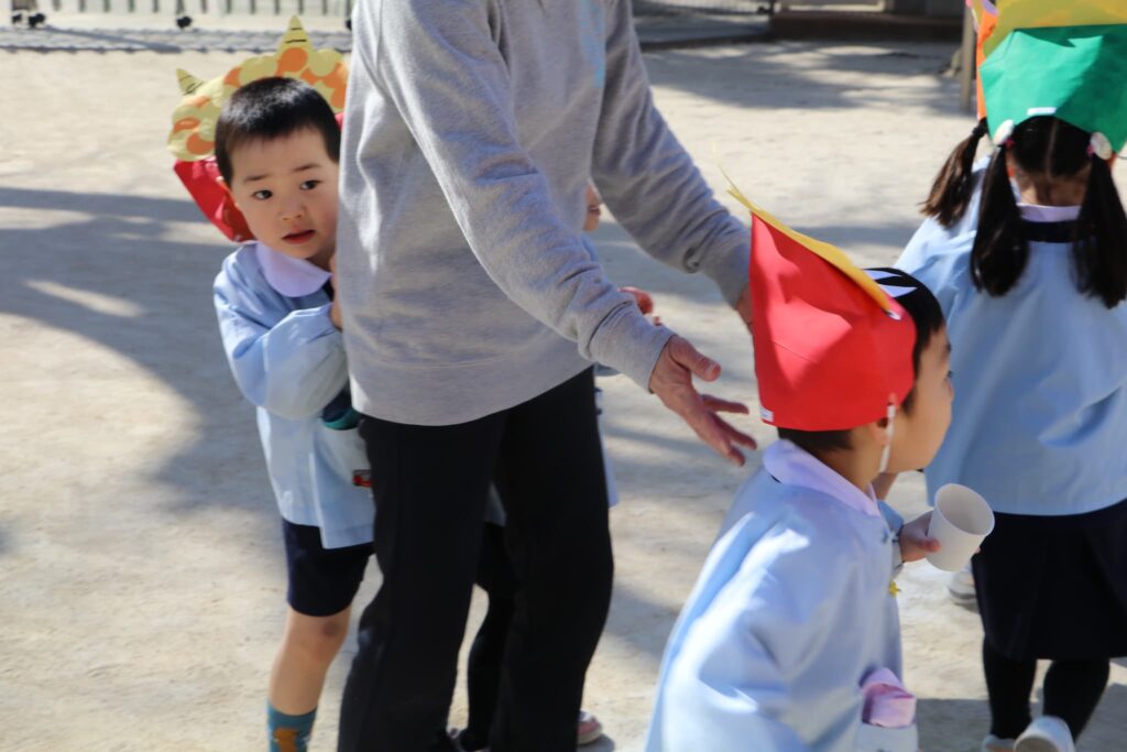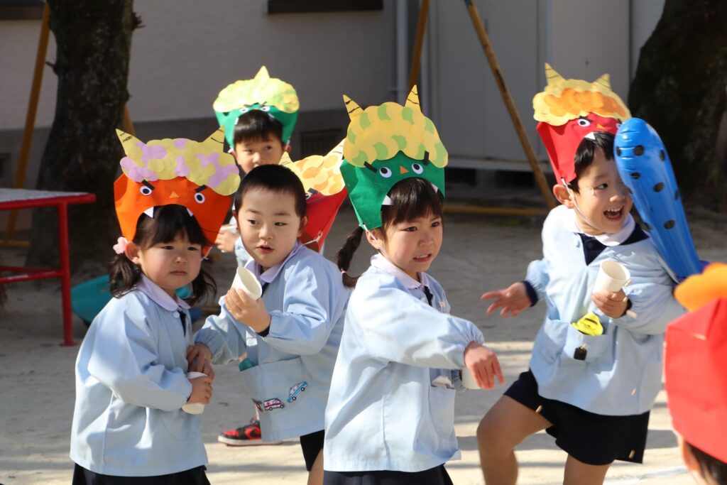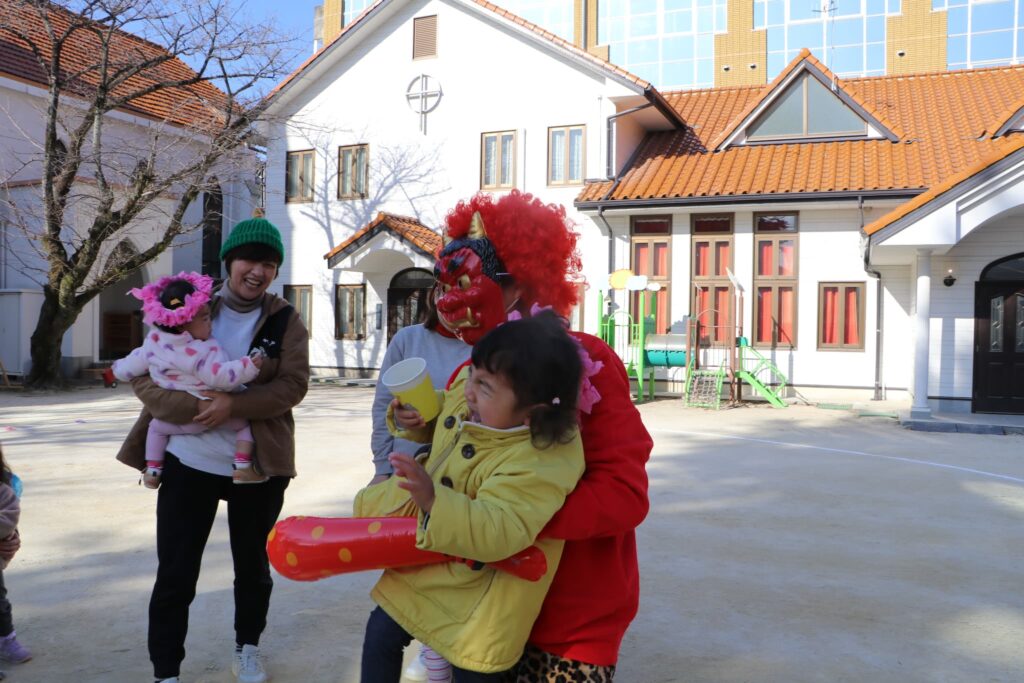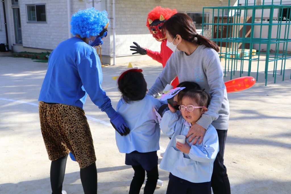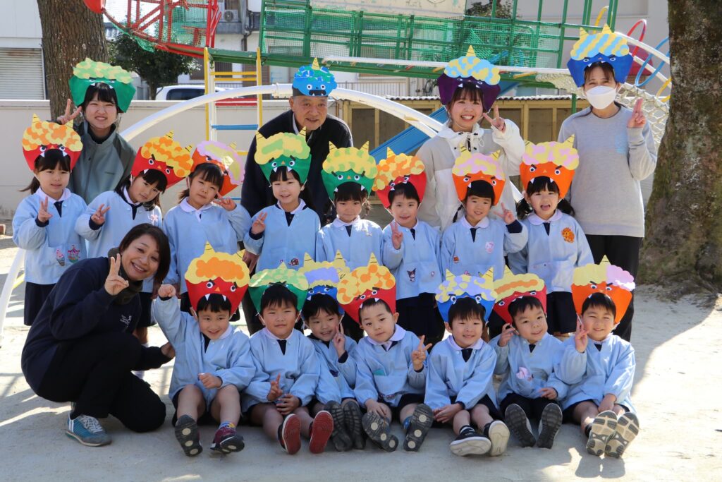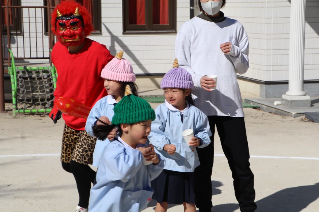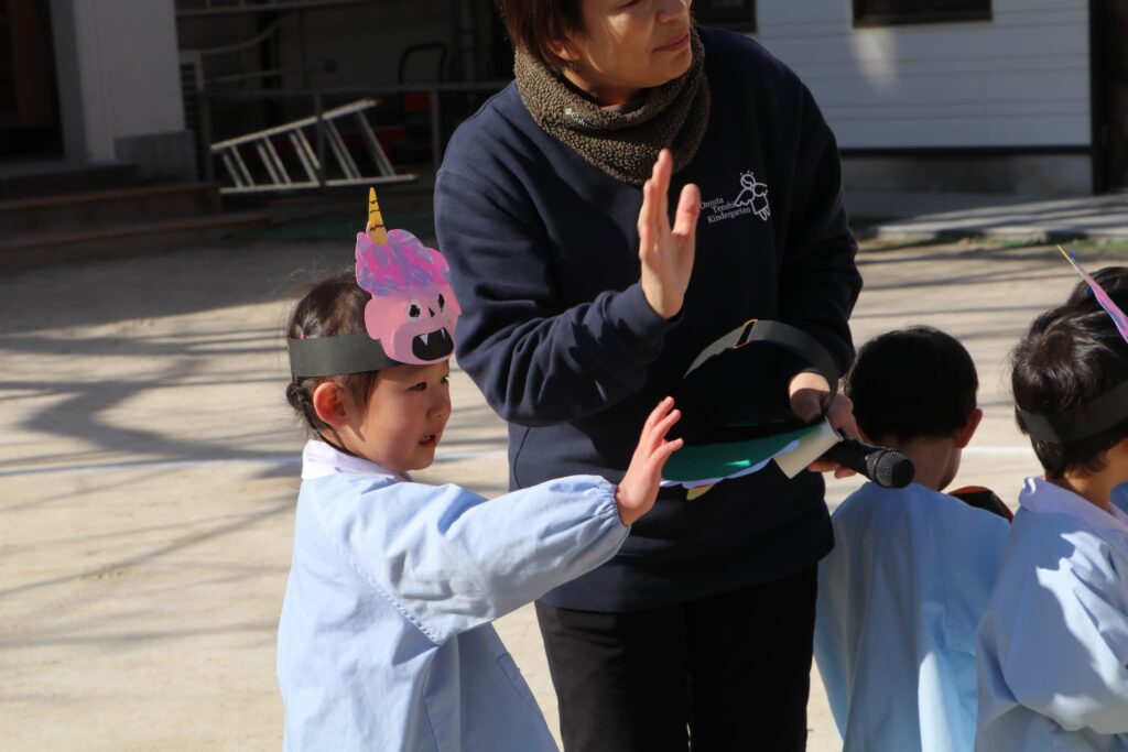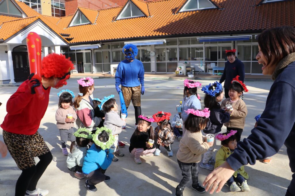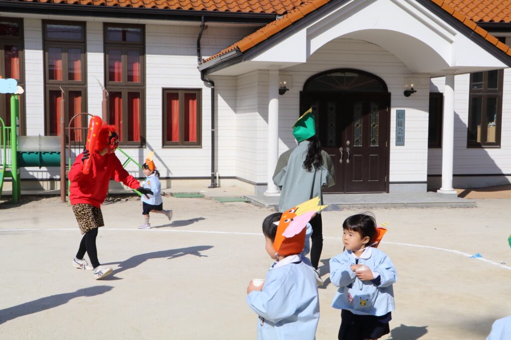 子どもたちが苦手とする日、『節分』。心の中にいる鬼を退治するために、怖い鬼さんにも立ち向かい、優しい福の神を招き入れることができたようです!子どもたちが製作した鬼のお面、帽子。お家で豆まきをするときにぜひ使ってくださいね♪