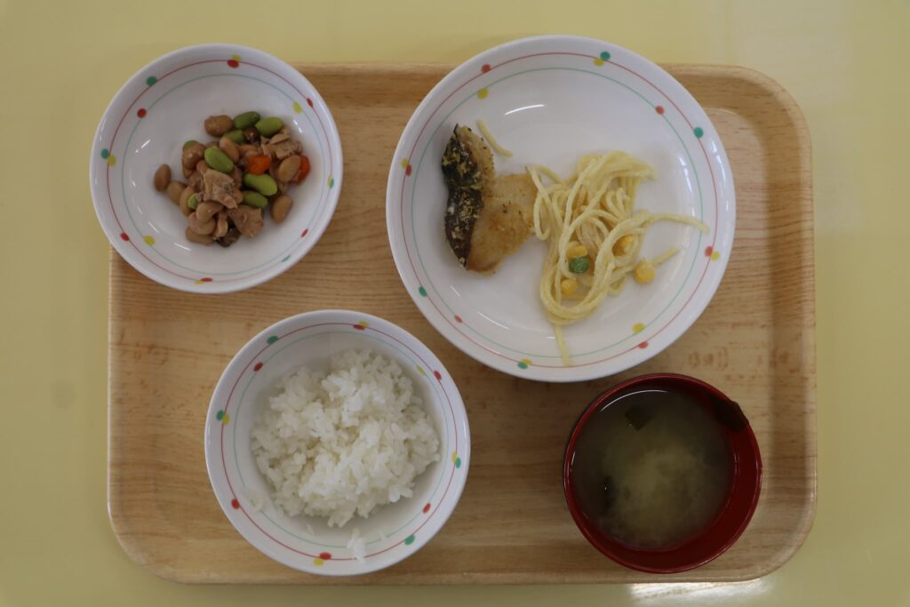 今日の給食:魚のカレーパン粉焼・大豆の五目煮・ごはん・みそ汁