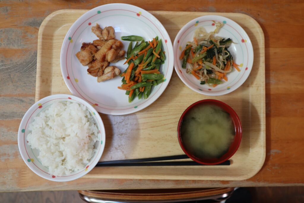 今日の給食:タンドリーチキン・もやしのごま和え・ご飯・みそ汁・牛乳