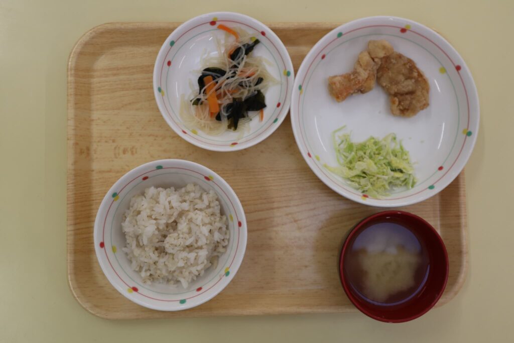 今日の給食:鶏肉の唐揚げ・春雨の酢の物・麦ごはん・みそ汁