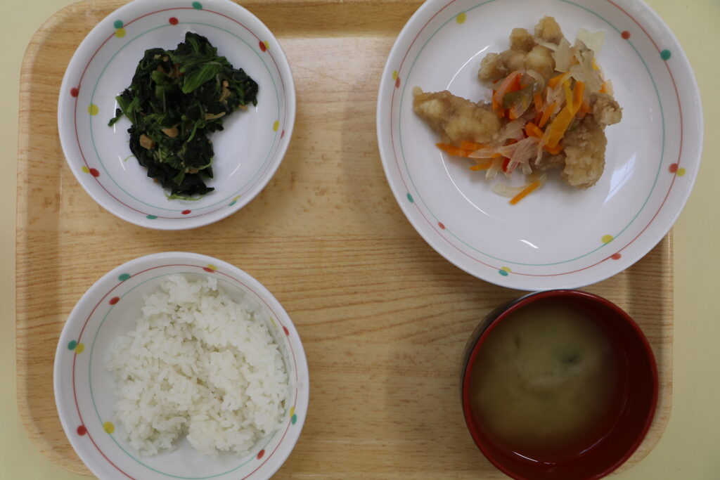 今日の給食:鶏肉の南蛮漬け・ほうれん草のなめたけ和え・ご飯・みそ汁